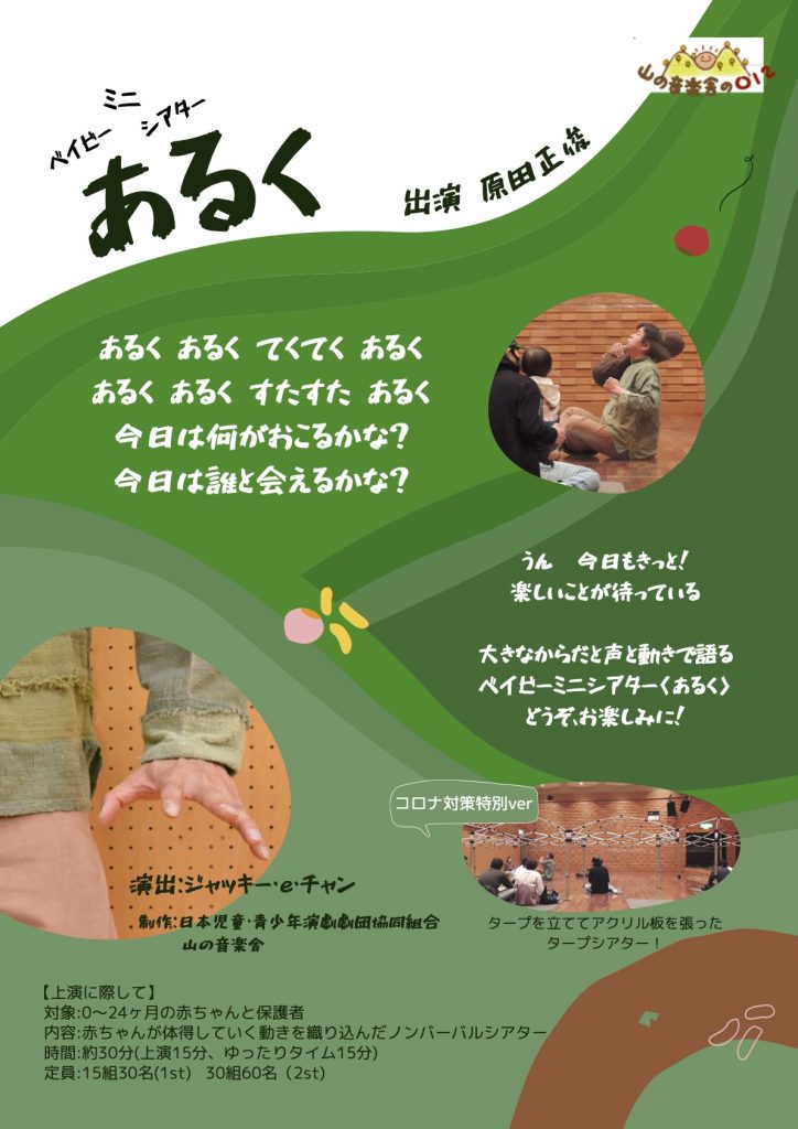 申込:参加希望の方は、「お問い合せ」ページの「各種お申し込み」から、お申し込みください。ぜひ、お子様と一緒にゆっくりしに来て下さい。ベイビーシアターは10時30分より30分くらいの観劇となります。前後の時間は、保育室や園庭を開放します。